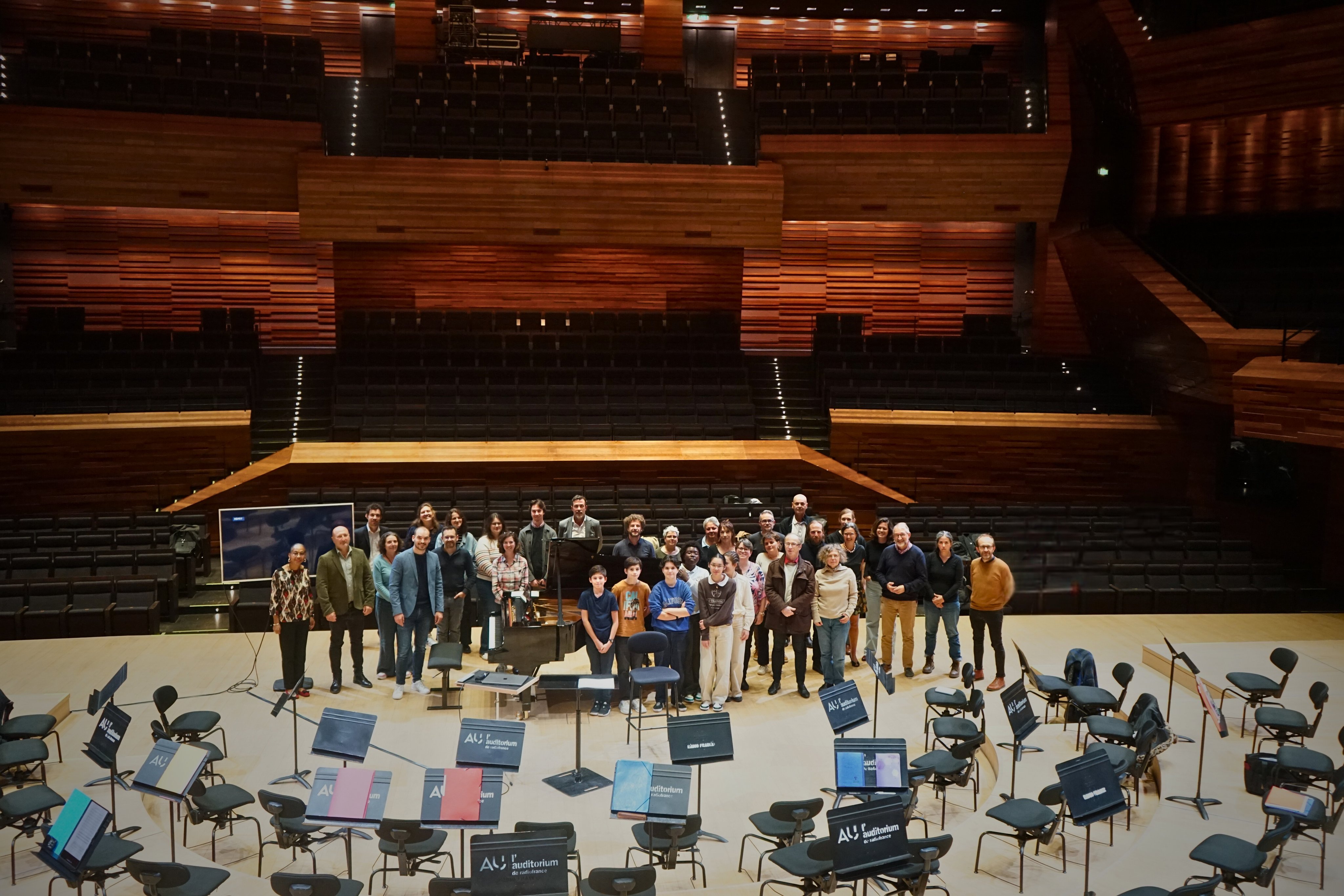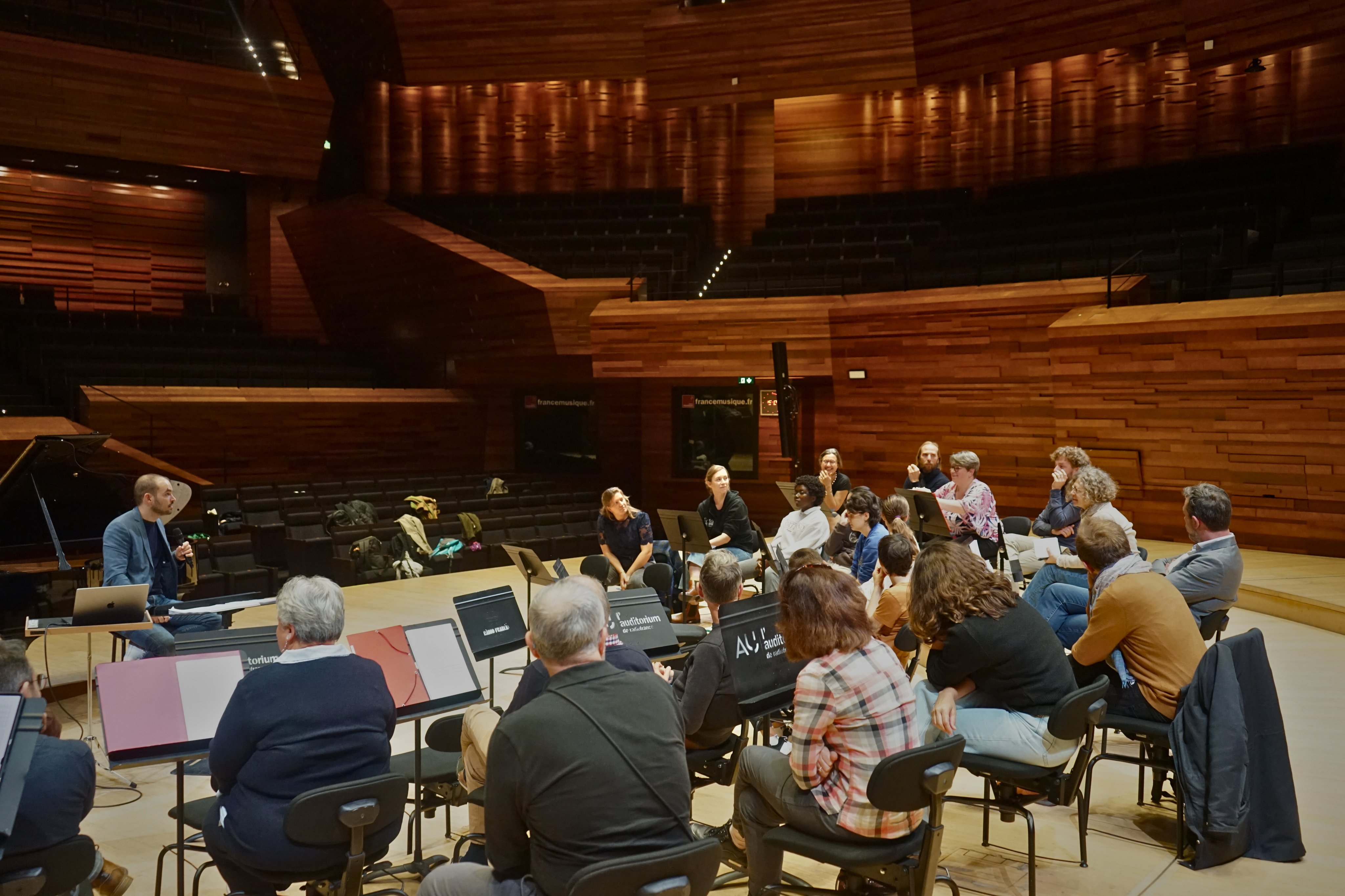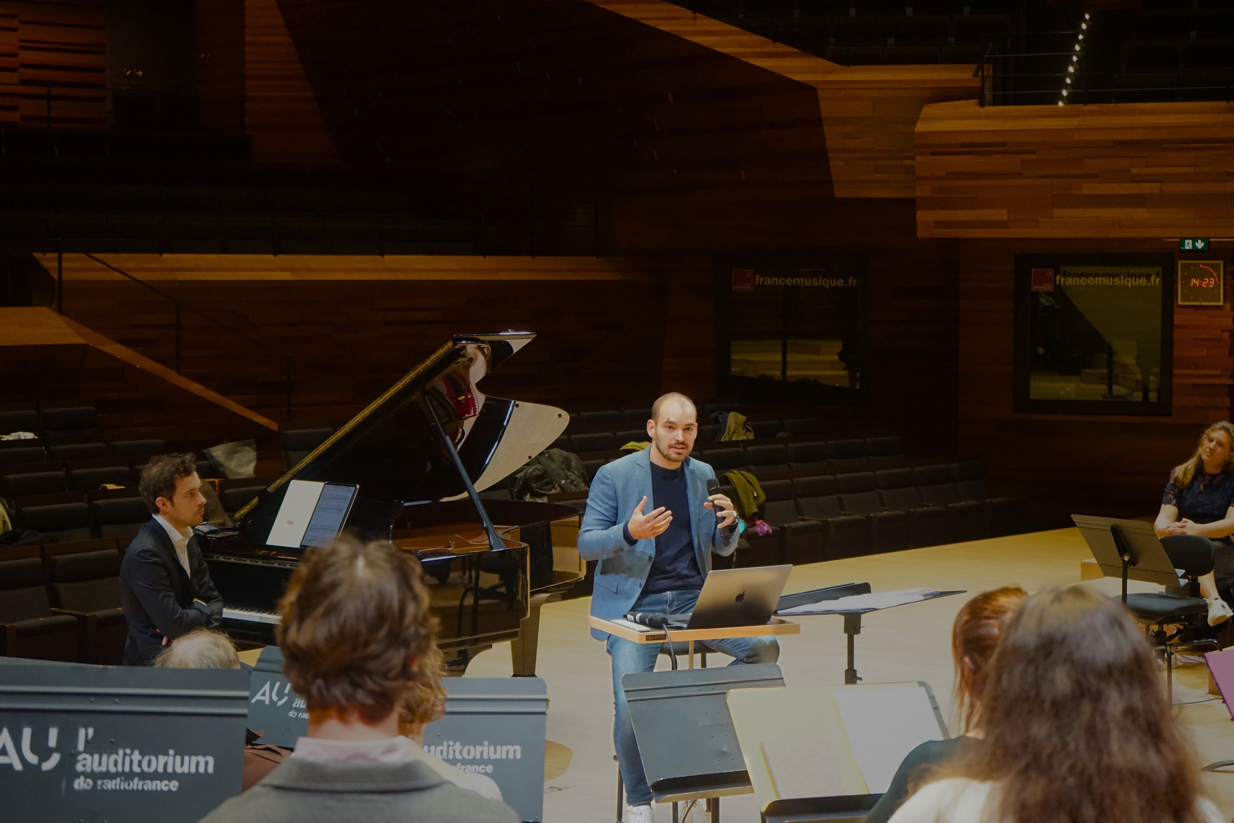 Les orchestres à l'école des collèges Villebois Mareuil de Montaigu-Vendée (85) et Henri Sellier, Suresnes (92) se produiront à la fin de l'année scolaire avec l'Orchestre Philharmonique de Radio France dans l'Auditorium de la Maison de la Radio. Pour préparer ce concert exceptionnel, des répétitions et deux stages auront lieu en présence des musicien·nes du « Philhar' ». L'oeuvre était présentée ce dimanche par le compositeur et jouée au piano par Pierre Cavion.